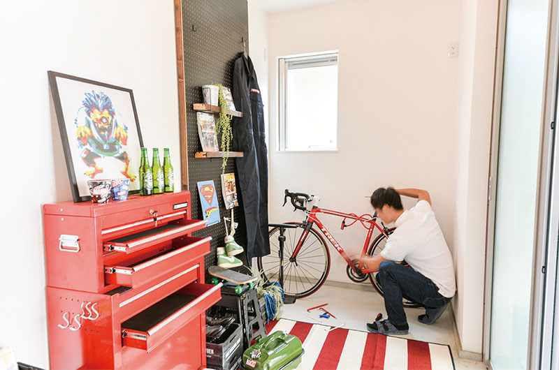 駐車場に併設された趣味の部屋。玄関から続く土間空間になっていて、アウトドア用品を置いたりDIYをしたりと、使い方はさまざまです。
