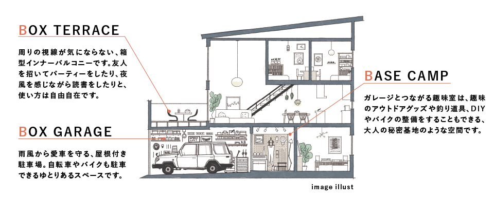 駐車場に併設された趣味の部屋。玄関から続く土間空間になっていて、アウトドア用品を置いたりDIYをしたりと、使い方はさまざまです。