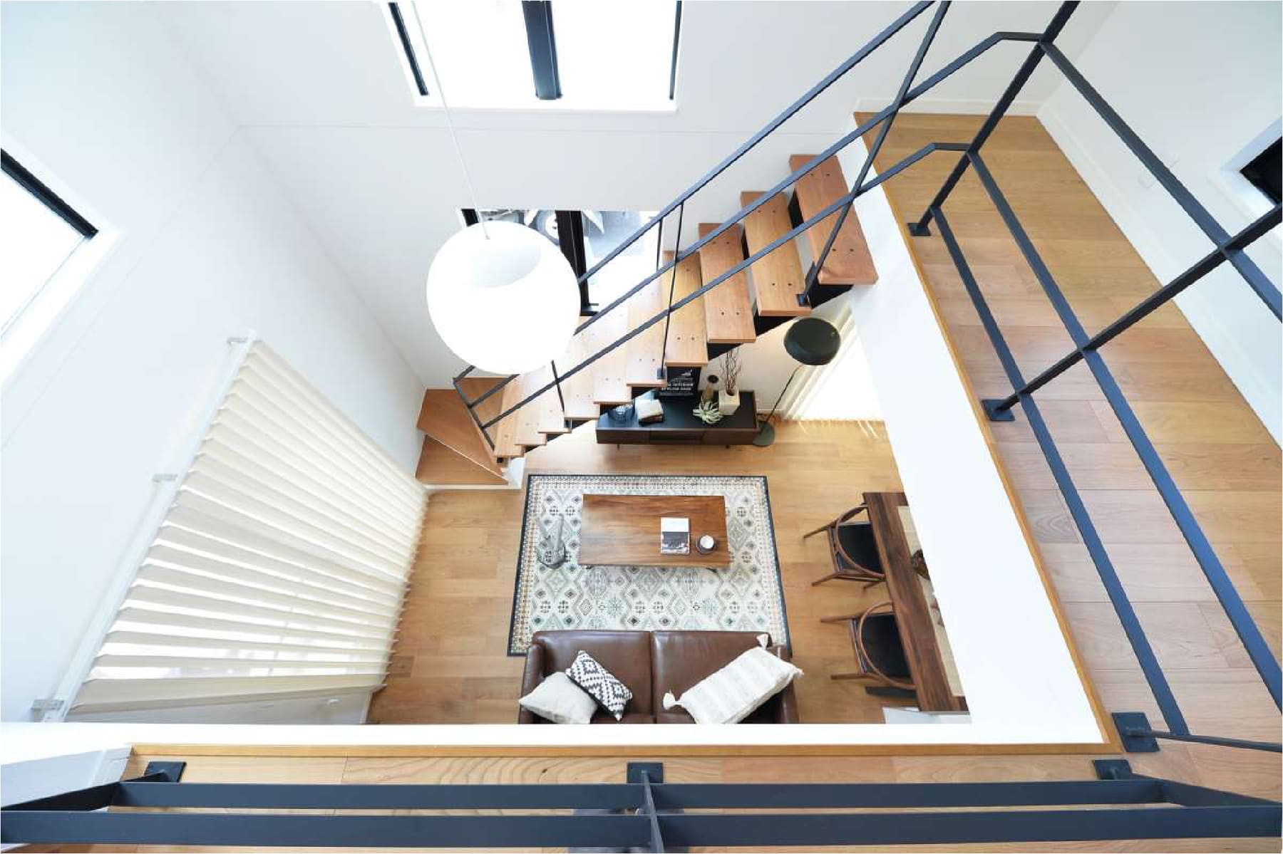 オープン階段とフラットバーの手すりが空間を広く見せ、開放感を演出します。