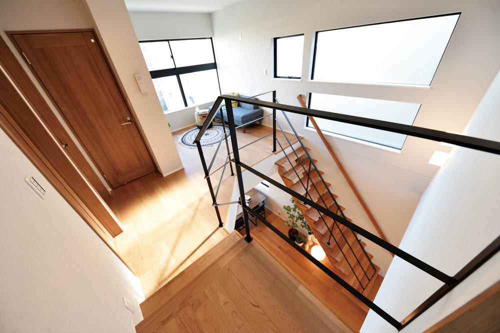 - 約19.7帖の広々LDKには、大きな吹き抜けから光が注ぎ、明るく開放的です。
