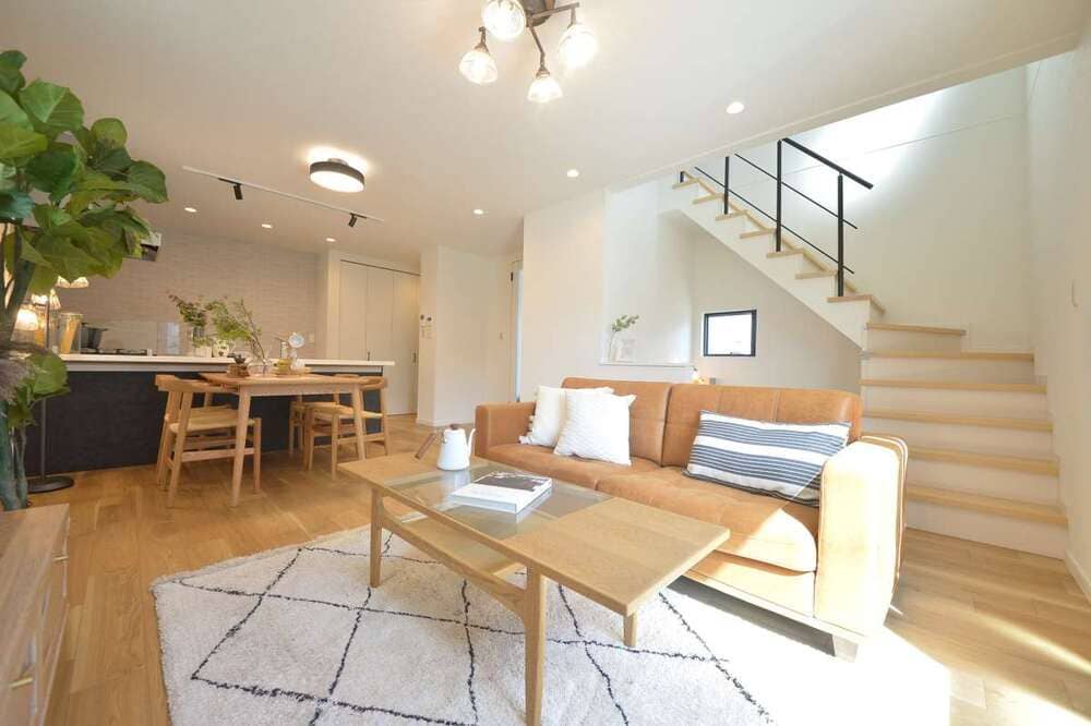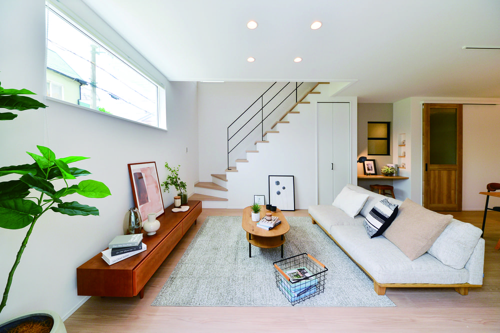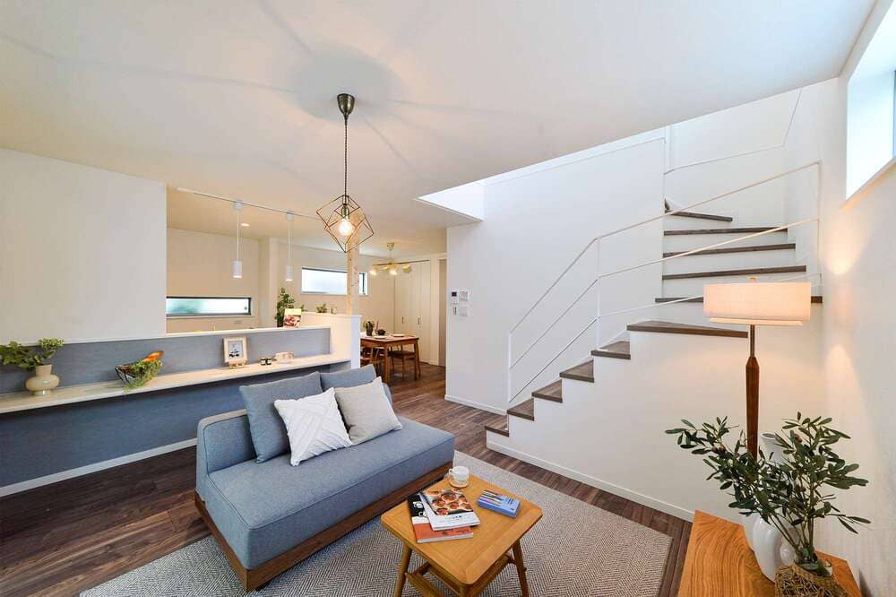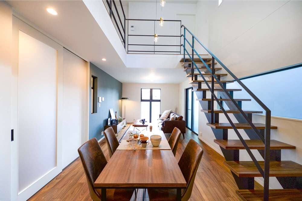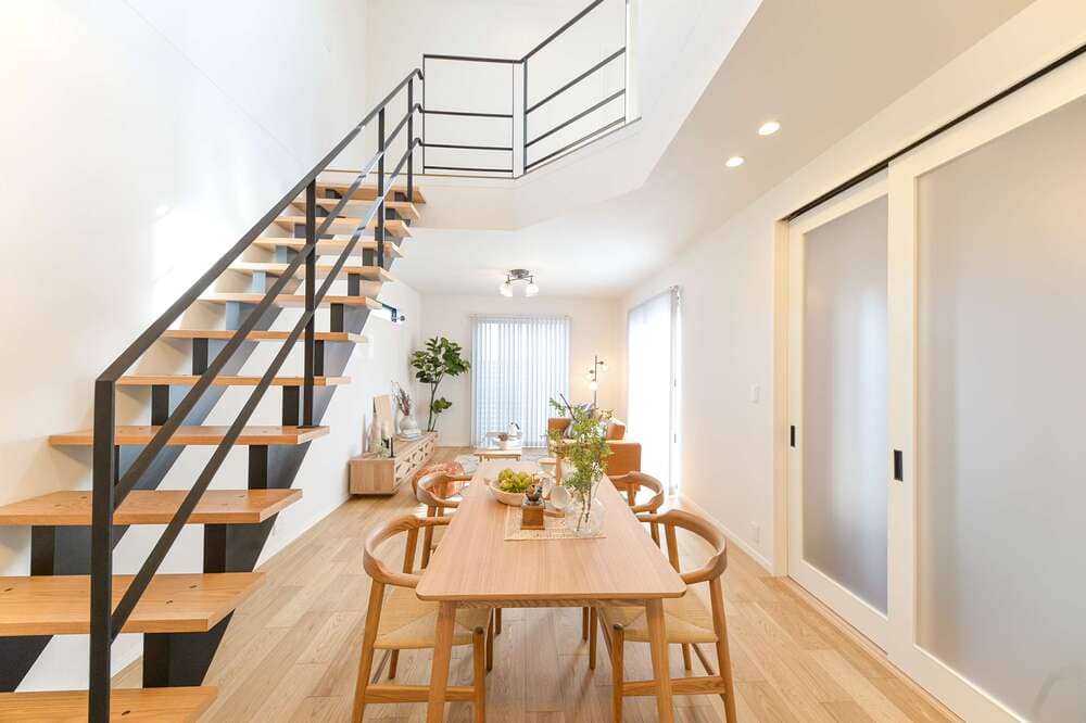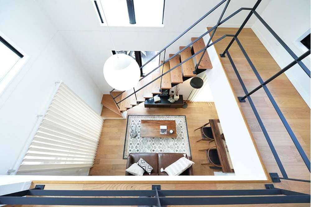 オープン階段とフラットバーの手すりが空間を広く見せ、開放感を演出します。