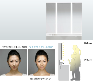 従来のLED照明では影ができやすかった「あごの下」や「顔の横側」にも、タテ型の2本の照明が顔全体をしっかり照らします。どの高さでもしっかり照らすので、背の高さに関係なくお子様も使いやすい仕様になっています。手元まで明るく見えるため、つけ置き洗いの汚れも見落としにくくなります。長寿命のLED照明なので、蛍光灯に比べ電気代も節約できます。
