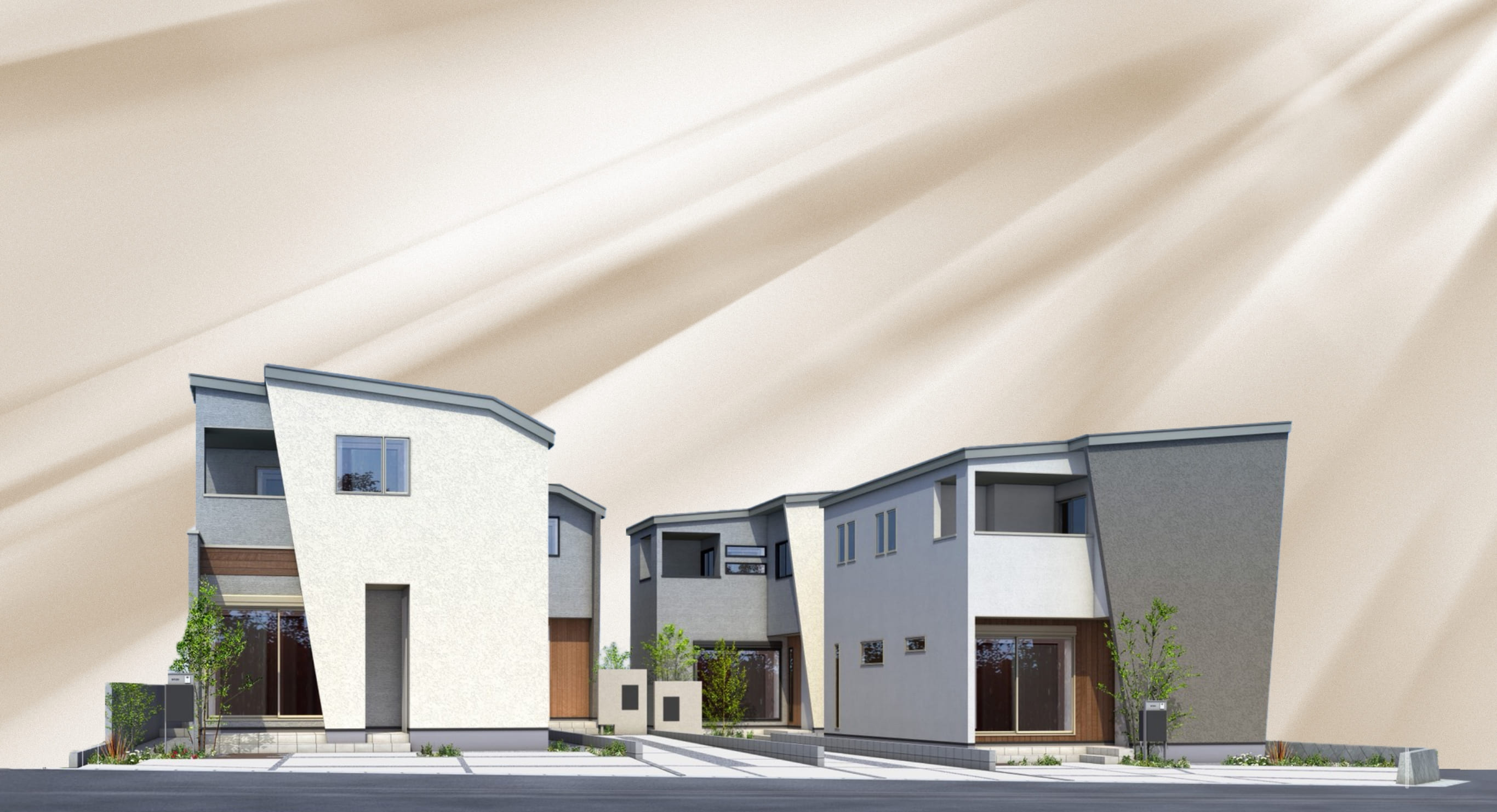 うち4区画は新築戸建。外観は片流れのファサードデザインで、